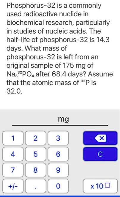 Solved Phosphorus 32 Is A Commonly Used Radioactive Nuclide In Biochemical Research Particularly In Studies Of Nucleic Acids The Half Life Of Phosphorus 32 Is 14 3 Days What Mass Of Phosphorus 32 In Milligrams Is Left From